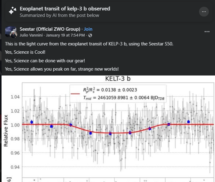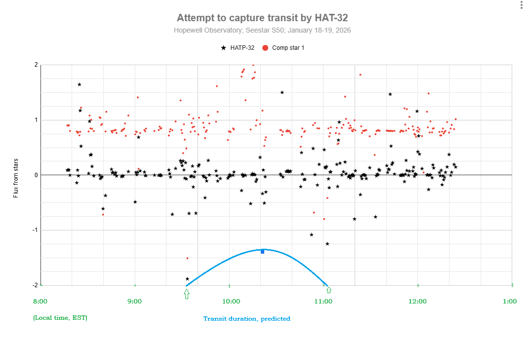 I used the Plan mode of my Seestar to take 30-second exposures of the star that looked like it would be the easiest to capture, namely HAT-P-32, which is in Andromeda at Right Ascension 02h 04m 10.00s and Declination +46° 41` 16.00″, It was supposed to have a depth of transit (or coverage of the star by the planet) of 22.2 parts per thousand, or 2.22%, which I thought sounded like quite a bit.