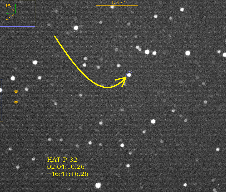 8. Once all of your images have been plate solved, then enlarge one of the images and find your star by checking the coordinates very carefully by moving your mouse around on the image. Since your image has been plate-solved, AIJ now knows exactly how to match the pixels on your screen to the coordinates in the sky, which is extremely impressive! (Try doing that yourself, by eye!) Pay attention to the ‘North” and “East” arrows. North is in the positive declination direction (degrees), and east is the positive right ascension direction (hours). Zoom in to your star, and then do a screen-snip and save it to some other app, and draw arrows showing exactly which star is the one you want, like I did here for my star, HAT-P-32. I also typed in its coordinates. This is for your own reference.