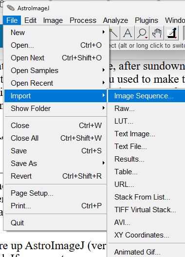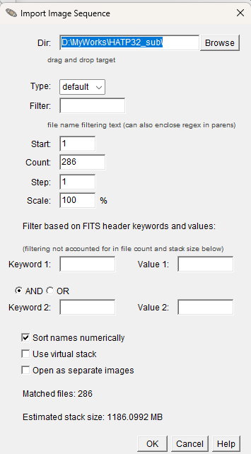 6. Fire up AstroImageJ (version 6) on your computer. Use File/Import Sequence to load that same sequence of subs that you just found. Keep in mind that some parts of the process (especially plate solving) might tie up your computer for a long time, perhaps hours. I would suggest only importing every 10th sub, to begin with, to find out if the whole stack of images is garbage or useful. If desired, you can always import the entire stack later. If I change the Step to 10, it will instead load image #1, then #11, then #21, and so on…