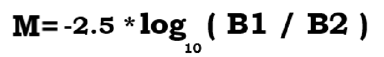 (M is the magnitude change, B1 is the actual measured flux of photons at time 1 or from star 1, and B2 is the same flux, measured the same way, at time 2 or from star 2.)