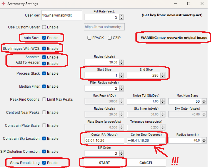 7. Then have AIJ do a plate-solve by chosing WCS (World Coordinate System) then Plate Solve with Astronometry.net (With Options). One of those options should be the coordinates of your star, which you should type in manually. You will need an Astronometry.net user key. You may use mine if you want: tyqwnsiwmabnvdlt. Make sure that Autosave and Skip Images With WCS are Enabled. When you have all that done, click on ‘Start’.