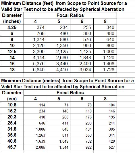 So, for example, if you have an 8 – inch diameter telescope mirror, which you made to be f/5 (ie with a focal length of 40 inches, pretty typical with us), then you need for your point source to be 880 feet away from your scope,. In metric units, that would be a 20 cm diameter and a distance of 268 meters.