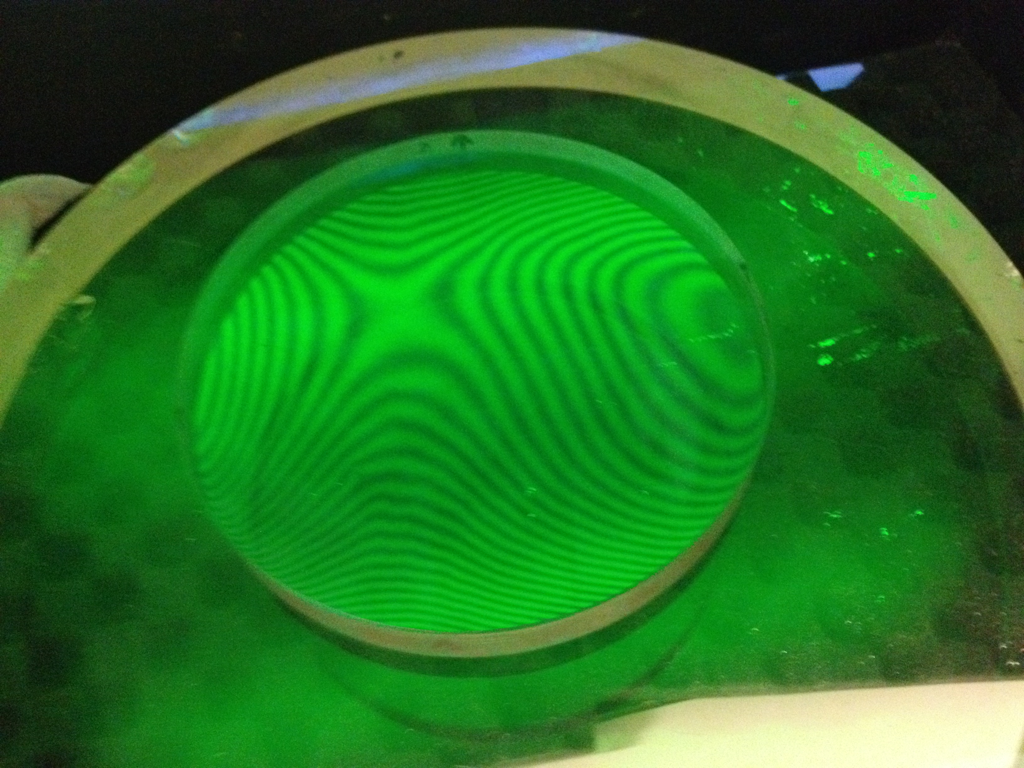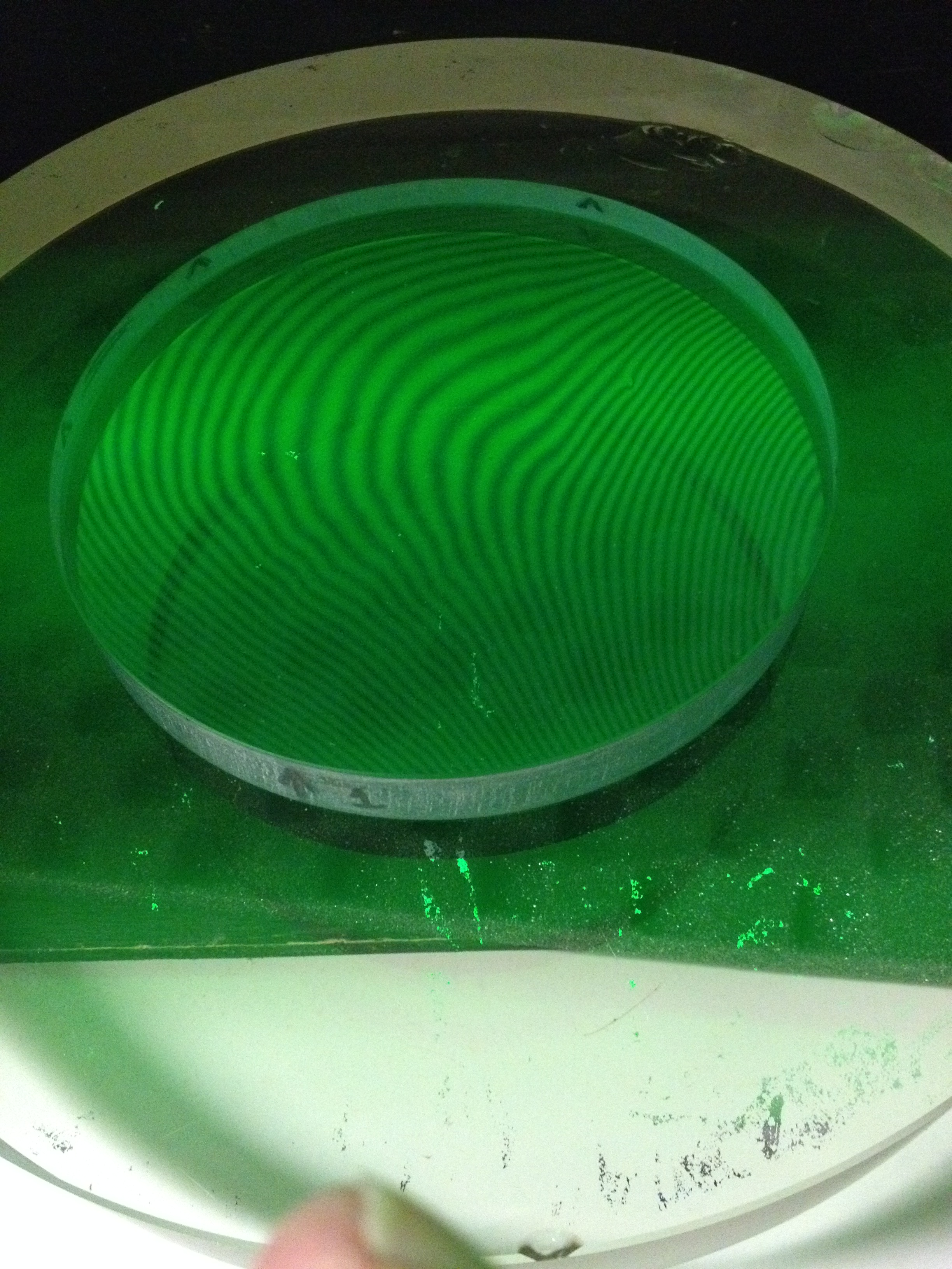 The test apparatus consists of a supposedly-flat 12-inch diameter and a monochromatic light box, and my own gradually-increasing understanding of what the interference lines actually mean. Essentially, they are like contour lines on a topographic map, but the trick is to figure out which sections represent valleys and which ones represent hills. It’s taken help from other amateur telescope makers (particularly Philip P) and sections of Malacara’s book on Optical Testing and http://www.lapping.com .