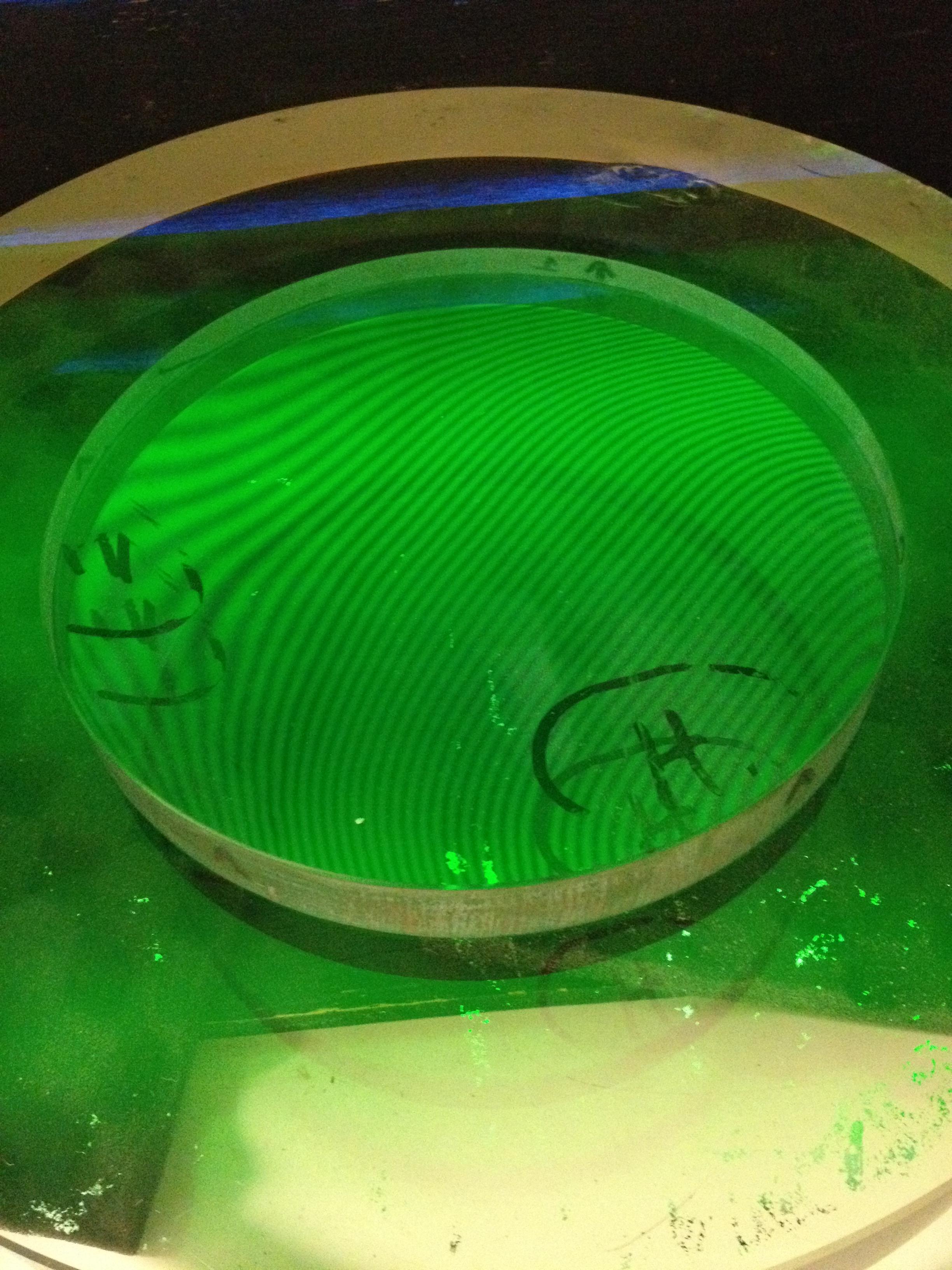 Up until this point I was trying to make the flat more perfect by using a hard Gugolz lap of full size (6 inches in diameter), much as we do with parabolizing concave mirrors. I don’t think I made a whole lot of progress. Then I read some of the papers that Philip P sent me, and re-read the Malacara, and decided to think of the contour lines in terms of measures of height, and decided to use a two-inch-diameter lap only on the parts that appeared to be “high”. I marked the back of those regions with a Sharpie permanent marker (which comes off easily with isopropyl alcohol when needed) so I could see where to work and could see if what I did made any difference.