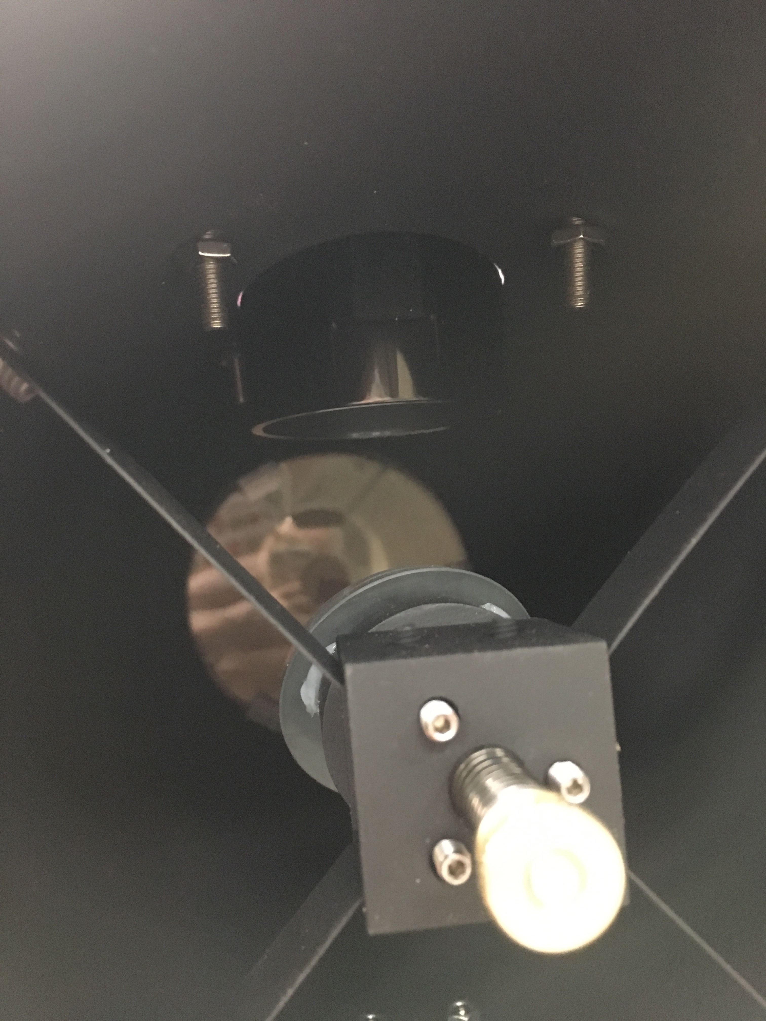 We also managed to do a star test using an artificial star on Oscar’s 6″ f/3. I made the testing rig with considerable help from Alan Tarica and Bill Rohrer. We reflected the light off of a known optical flat so as to double the testing distance. We had everybody in attendance at the telescope=making workshop examine the inside- and outside-of-focus images, and we all agreed that using the images in Richard Suiter’s book, it’s a bit overcorrected, probably somewhere near 1/4 wave of green light, which was what we were using — a green laser pointer attenuated and stopped down to about 100 micron hole. But good enough.