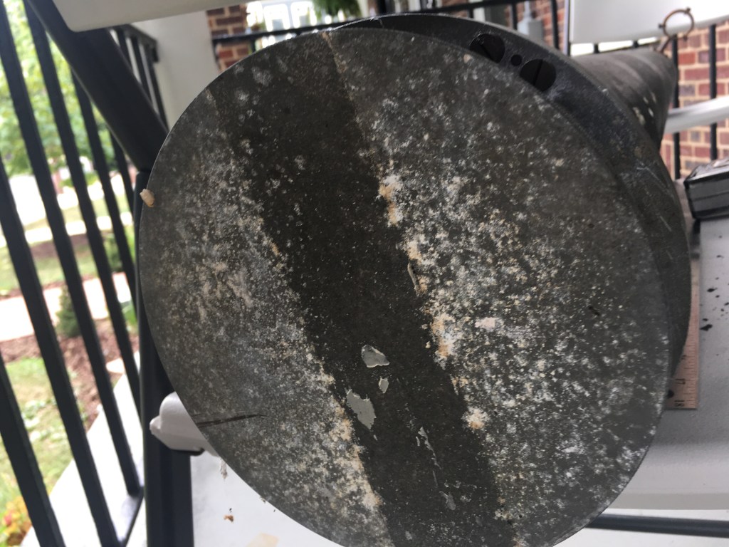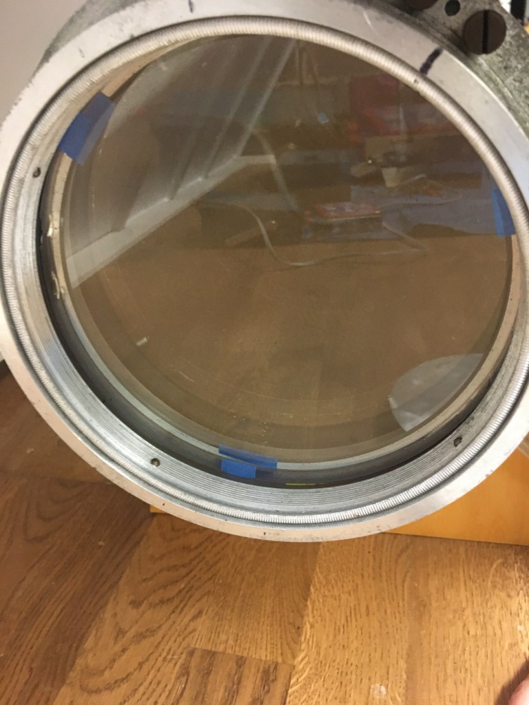Unfortunately, the whole device is rather heavy, and we already own a nice 6″ f/15 refractor made by Jaegers, as well as some Schmidt-Cassegrain telescopes that also have long focal lengths. Putting this scope on its own pedestal, outside our roll-off roof, with adequate protection from both the elements and from vandals, or figuring out a way to mount it and remove it when needed, are efforts that we don’t see as being wise for us.