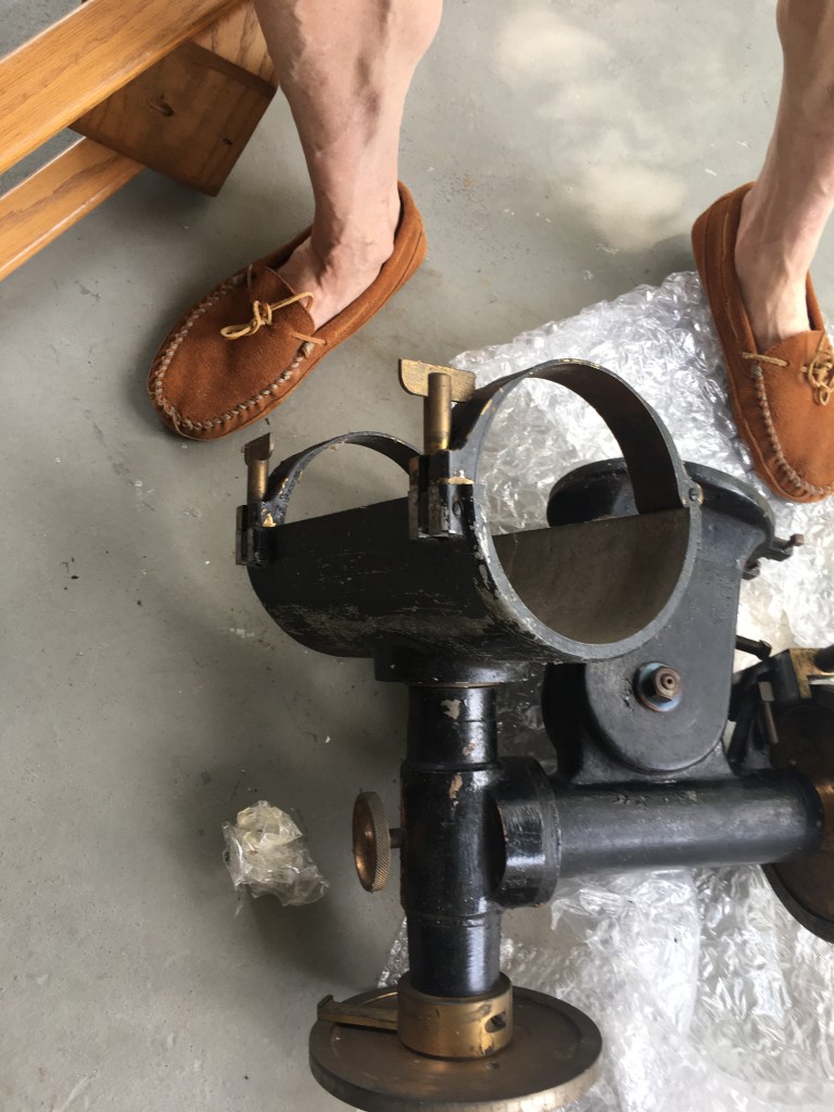 The attribution of the mount to Brashear was by Bart Fried of the Antique Telescope Society, who said that quite often Brashear didn’t initial or stamp his products. Looking at known examples of Brashear’s mounts, I think Fried is probably correct. Kiess’s son said he thought that the optics were made by an optician in California, but he didn’t remember any other details. His father got his PhD at UC Berkeley in 1913, and later worked at the Lick Observatory before settling in the DC area. The company that Brashear became doesn’t have any records going back that far.