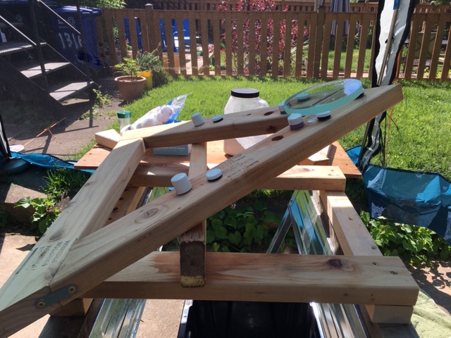 I made the jig to hold the mirrors out of some scrap two-by-fours, some screws and reinforcement plates; two old hinges; some nylon chair feet; some 1/2″ PVC pipe; and some 1/2″ PVC end caps.