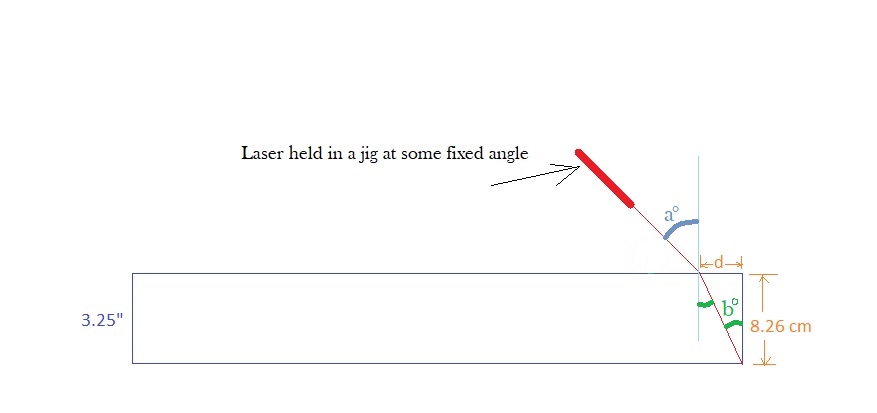 I marked where the laser is impinging upon the glass, and I measured the distance d from that spot to the top edge of the glass.