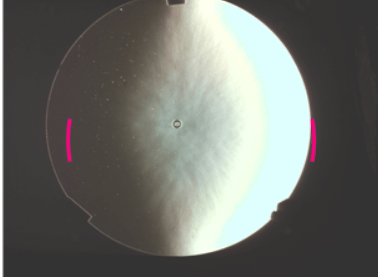 I then captured and pasted that image into Geometer’s Sketchpad, which I used to draw and measure the radii of two circles, centered at the doughnut marking the center of the mirror. This is a somewhat crude measurement of the radii, but it appears that this zone is is at 83% of the diameter (or radius) of the original disk, which is 16 inches across.