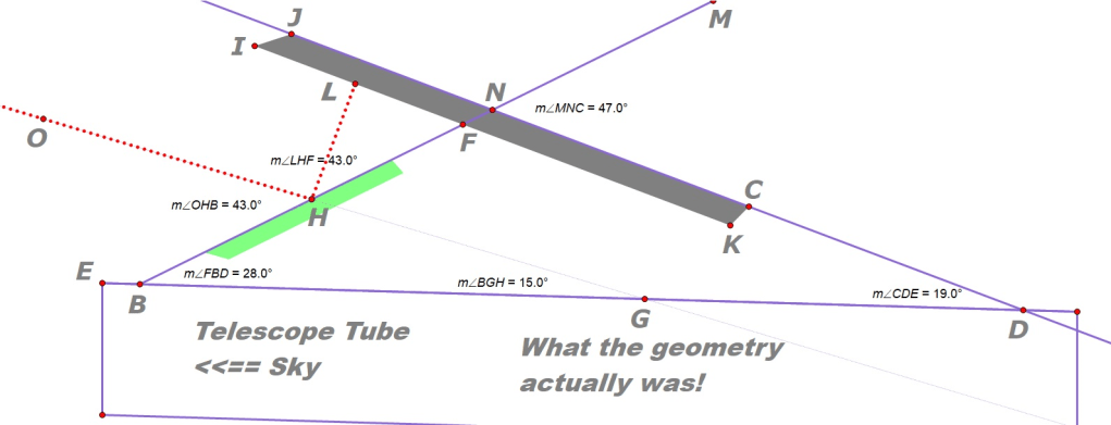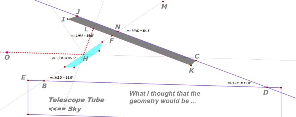 Here is a version of the diagrams we made that showed what we predicted all the angles would be so that optical axis OH will be parallel to the tube axis EBD, and that lens angle ILH is a right angle. We predicted that the mirror’s axis would need to be tilted upwards by an angle of 35.5 degrees (anle HBD).