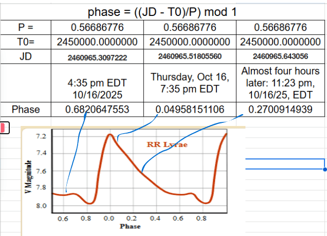 (It is amazing how fast the computer works this out! I’m used to my middle school or high school students working things out like this by hand at first — it’s a very slow and tedious process! Let us give a tip of the hat to Williamina Fleming, who was the first person to notice and record that RR Lyrae was a variable star. She did so by examining glass plates on which were little dark spots made by stars’ light striking particles of suspended silver nitrate, without a blink comparator! Wow!)
