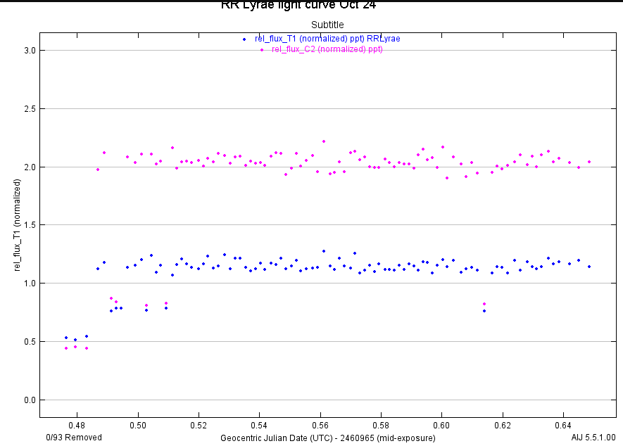 Which is barely any change at all. The few pairs of dots below the blue blob line are glitchy data that should be ignored; notice that it happens for both stars. In fact, I see more variability in the pink comparison star’s brightness than I do with RRRLyrae.