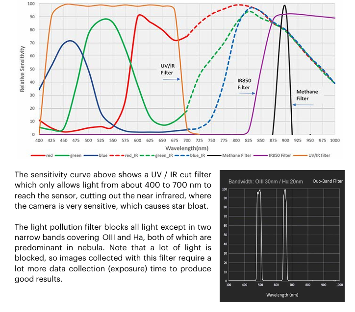 Number 5 can be done by using the built-in light pollution filter, whose transmission bandwidth is very small. It’s the bottom graphic below.
