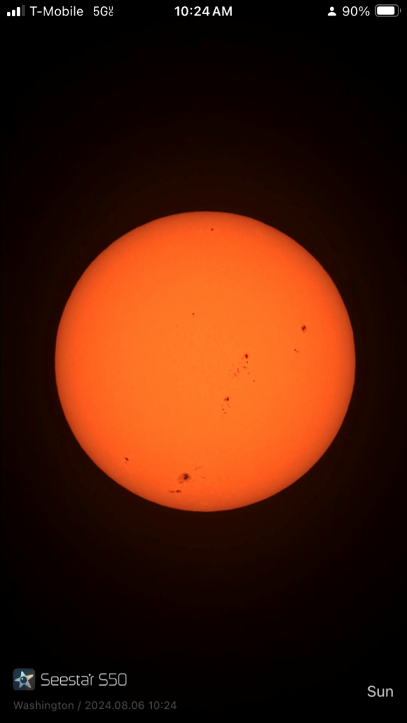 The device woke up, and after less than a minute of self’s-calibration, it pointed very accurately at the sun and focused itself perfectly. It produces a continuous feed; I even did 100 frames of a time-lapse. It’s all stored on my cell phone but I can share the photos or even live views with folks nearby.