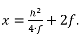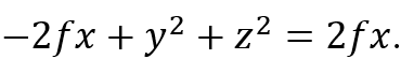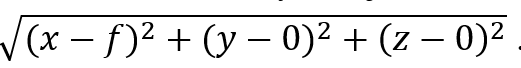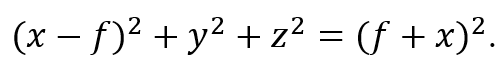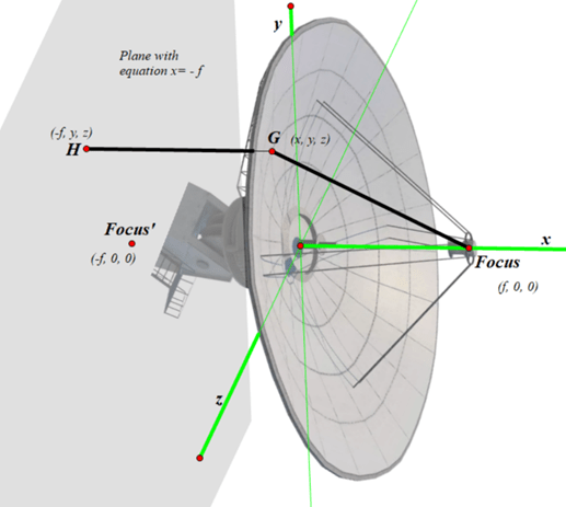 To make it simple, the plane in question will be on the opposite side of the origin; its equation is x = -f. We will pick some random point G anywhere on the surface of the parabolic dish antenna and call its coordinates (x, y, z). We will see what equation these conditions create. We then drop a perpendicular from G towards the plane with equation x = -f. Where this perpendicular hits the plane, we will call point H, whose coordinates are (-f, y, z). We need for distance GH (from the point to the plane) to equal distance from G to the Focus. Distance GH is easy: it’s just f + x. To find distance between G and Focus, I will use the 3-D distance formula: