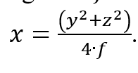 Let us define a paraboloid as the set (or locus) of all points in 3-D space that are equidistant from a given plane and a given focal point, whose coordinates I will arbitrarily call (f, 0, 0). (When deciding on a mirror or radio dish or reflector on a searchlight, you can make the focal length anything you want.)