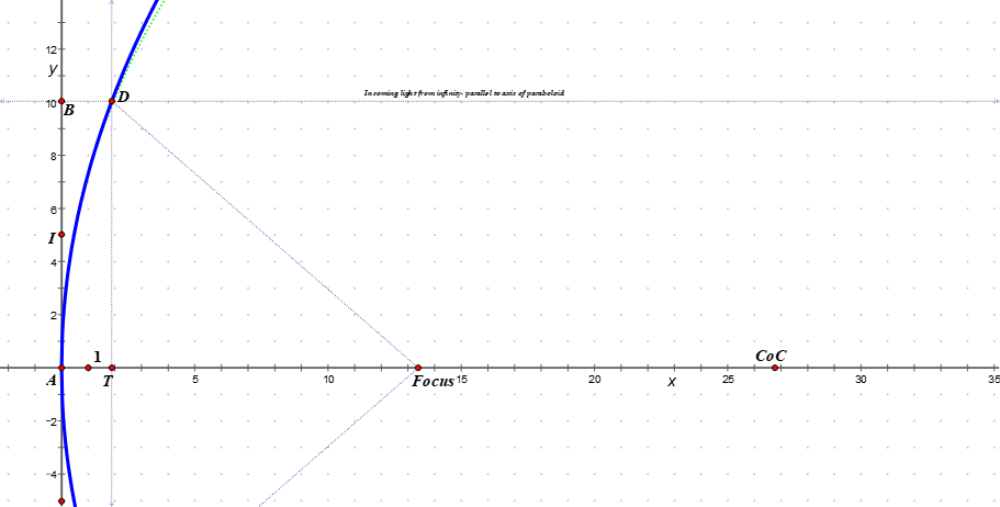 In my diagram, you can see a very thin line, parallel to the x-axis, coming in from a distant star (meaning, effectively at infinity), bouncing off the parabola, and then hitting the Focus.