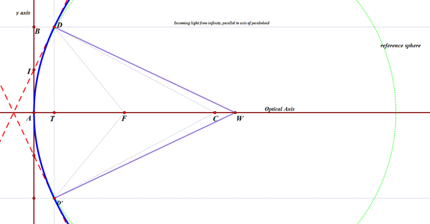 where f represents the focal length. (For simplicity, I have put the vertex of the paraboloid at the origin, which I have called A. I have decided to make the x-axis (green, pointing to our right) be the optical and geometric axis of the mirror. The positive z-axis (also green) is pointed towards our lower left, and the y-axis (again, green) is the vertical one. The focal point is somewhere on the x-axis, near the detector; let’s pretend it’s at the red dot that I labeled as Focus.)