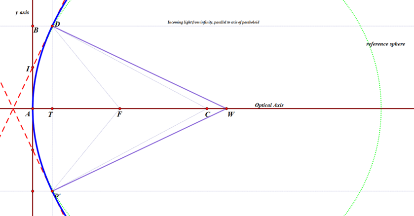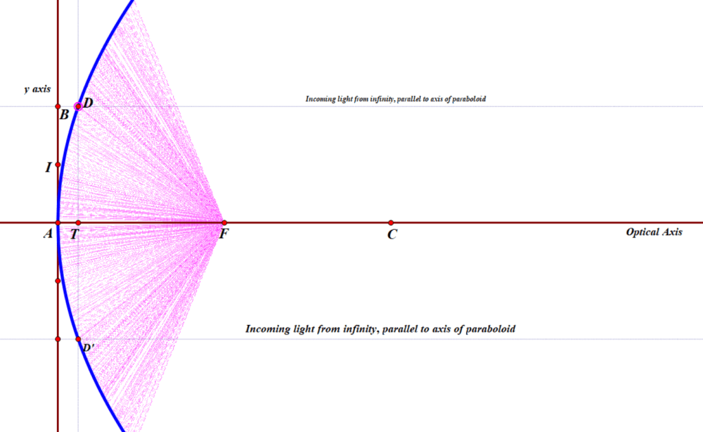 D is a random point on that parabola, much like point G was earlier, and D’ being precisely on the opposite side of the optical axis. The great thing about parabolic mirrors is that every single incoming light ray coming into the paraboloid that is parallel to the axis will reflect towards the Focus, as we saw earlier. Or else, if you want to make a lamp or searchlight, and you place a light source at the focus, then all of the light that comes from it that bounces off of the mirror will be reflected out in a parallel beam that does not spread out.