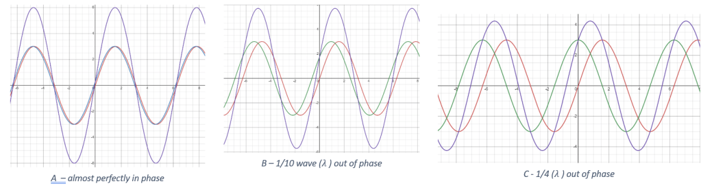 Next, in diagram B, I draw the red and green waves being out of phase by one-tenth of a wave (0.10 lambda) , and then in diagram C they are ‘off’ by ¼ of a wave (0.25 lambda). You will notice that in the diagrams B and C, the dark blue wave (the sum of the other two) isn’t as tall as it was in diagram A, but it’s still taller than either the red or green one.