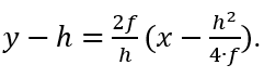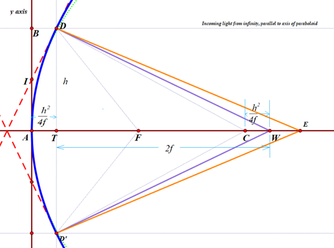 I also drew two red, dashed lines that are tangent to the paraboloid at point D and D’. I am calling the y-coordinate of point D as h (D has y-coordinate -h)and the x-coordinate of either one is
