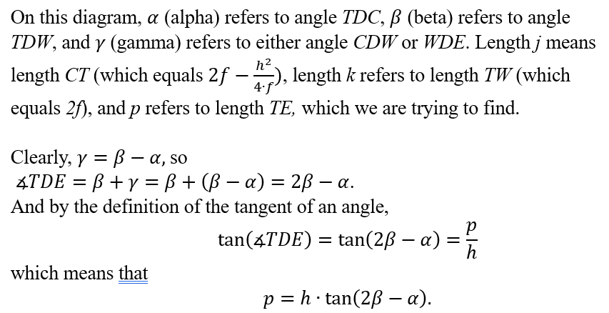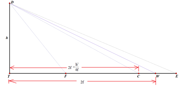 Or, in other words, CW = AT = DE. This means: if you are testing a parabolic mirror with a moving light source at point W, then a beam of light from W that is aimed at point D on the paraboloid will come right back to W, and the longitudinal readings of distance will follow the rule h2/(4f), where h is the radius of the zone, or ring, that you are measuring. Other locations on the mirror which do not lie in that ring will not have that property. This then is the derivation of the formula I was taught over 30 years ago by Jerry Schnall, and found in many books on telescope making – namely that for a moving light source, since R=2f,