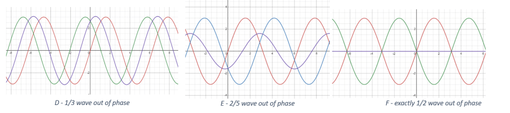 Diagram E shows what happens is what happens when the waves are 2/5 (0.40 lambda) out of phase – the blue curve, the sum of the other two, now has a smaller amplitude than its components!