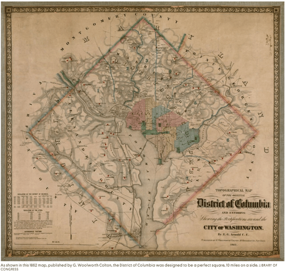 Let’s try to visualize this by enlarging the mirror. At our mirror shop, we generally help folks work on mirrors whose diameters are anywhere from 11 cm (4 ¼ inches) to 45 cm (18 inches) across. Suppose we could magically enlarge an 8” (20 cm) mirror and blow it up so that it has the same diameter as the original 10-mile (16 km) square surveyed in 1790 by the Ellicott brothers and Benjamin Banneker for the 1790 Federal City. (If you didn’t know, the part on the eastern bank of the Potomac became the District of Columbia, and the part on the western bank was given back to Virginia back in 1847. That explains why Washington DC is no longer shaped like a nice rhombus/diamond/square.)