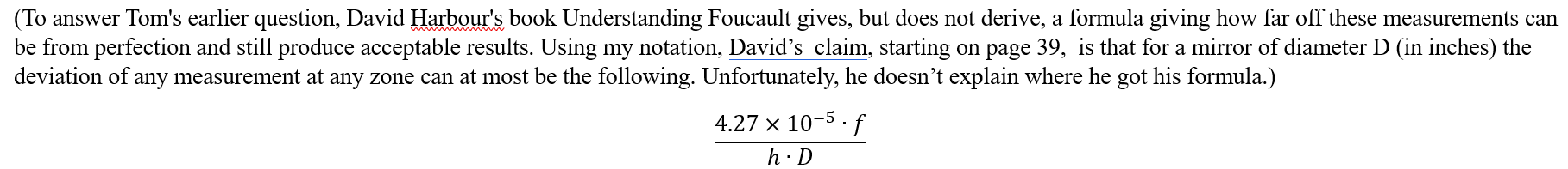 When I did the calculations which follow, I found, to my surprise, that one of the formulas I had been taught and had read about in many telescope-making manuals, was actually not exact, and that the one I had been told was inherently less accurate, was, in fact, perfectly correct! Alan Tarica sent me an article from 1902 supposedly explaining the derivation of a nice Foucault formula, but the author skipped a few bunch of important steps, and I don’t get anything like his results. it took me a lot of work, and help from this rising 8th grader, to find and fix my algebra errors. I now agree with the results of the author , T.H.Hussey.